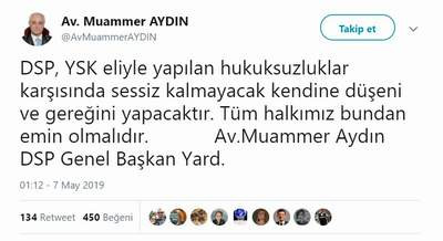 Aydın, "DSP, YSK eliyle yapılan hukuksuzluklar karşısında sessiz kalmayacak kendine düşeni ve gereğini yapacaktır" dedi.