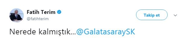 Fatih Terim, Twitter hesabından "Nerede kalmıştık" diyerek Galatasaray resmi hesabını etiketledi.