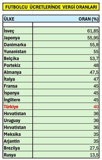 Avrupa ve dünyada futbolculardan hangi oranlarda vergi alındığını aşağıdaki tabloyla sizlerle paylaşıyorum.