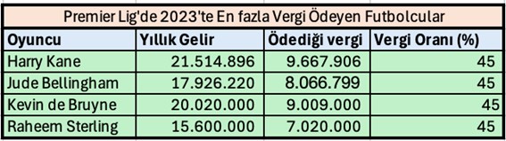 İngiliz maliyesinin İngiltere’deki kazançlarından dolayı vergilendirdiği ve en yüksek vergiyi ödeyen dört oyuncu aşağıdaki tabloda görülüyor.