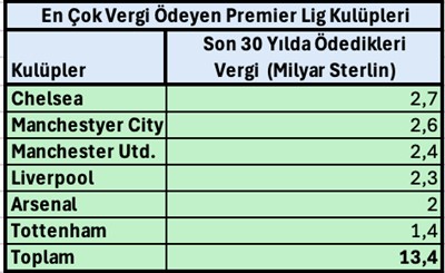 Premier Lig kulüplerinin vergi ödeme konusundaki performansları sportif performanslarıyla örtüşüyor. Yeşil sahalarda başarılı olan kulüpler daha fazla vergi veriyor. Nitekim bu kapsamda, İngiliz liginin en başarılı altı kulübünün son otuz yılda maliyeye ödedikleri vergi toplamı 13.4 milyar sterline ulaştı.