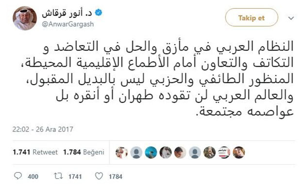 Mezhepsel ve partizan yaklaşım kabul edilebilir bir alternatif değil. Arap dünyası Tahran ve Ankara tarafından yönetilmeyecektir” yazdı.