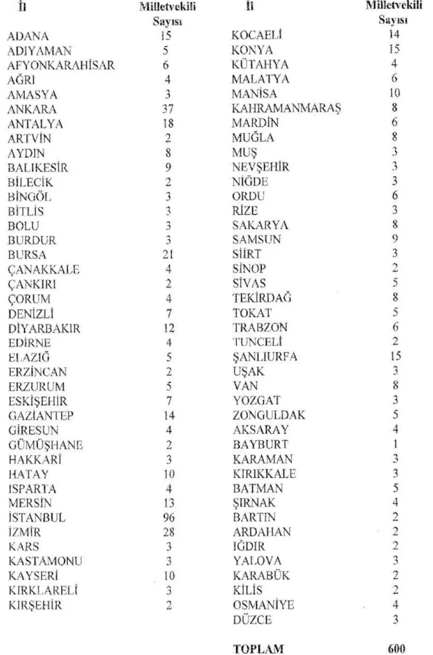 Kalan milletvekillikleri ise nüfusa göre iller arasında dağıtıldı.