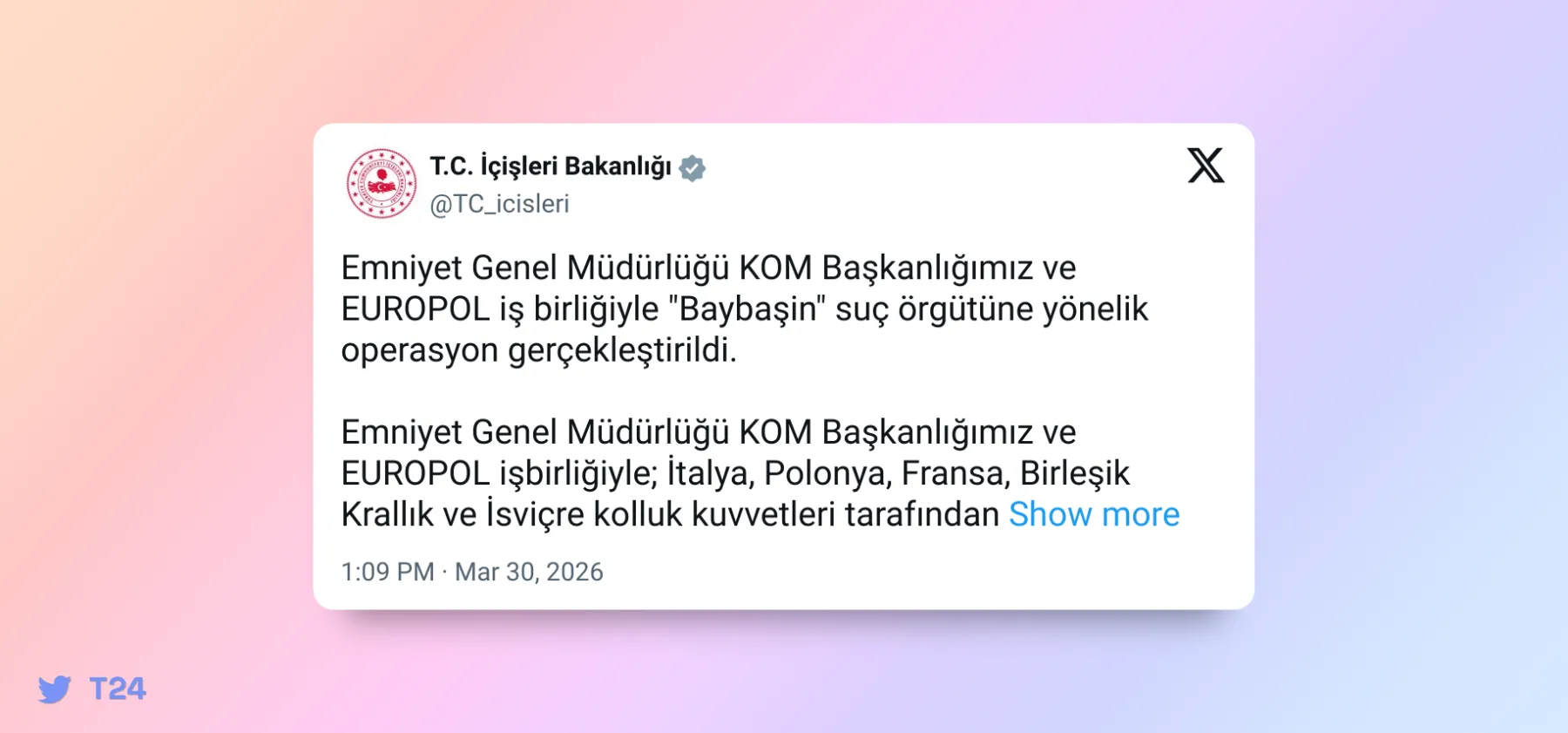 İçişleri Bakanlığı, Emniyet Genel Müdürlüğü KOM Başkanlığı ile EUROPOL iş birliğinde “Baybaşin” suç örgütüne yönelik operasyon gerçekleştirildiğini açıkladı.